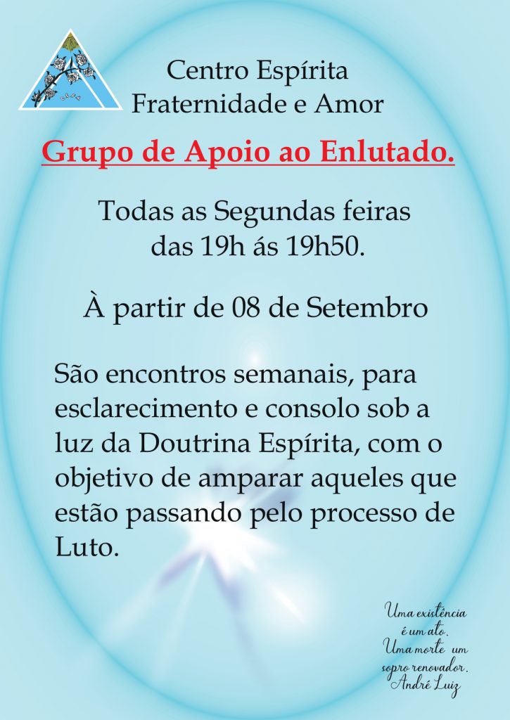 Encontros semanais para esclarecimento e consolo sob a luz da Doutrina Espírita, com o objetivo de amparar aqueles que estão passando pelo processo de luto.