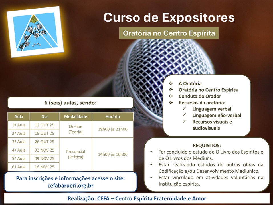 O CEFA realizará o Curso de Expositores: Oratória Espírita, destinado a apresentar técnicas de oratória e…